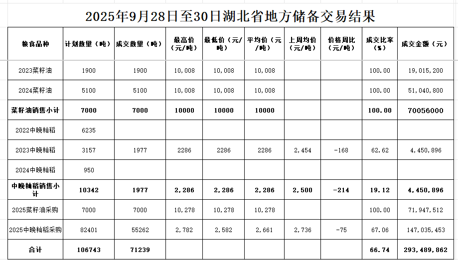 本周湖北地储成交各类粮油71239吨。其中销售:2023年菜籽油1900吨,成交率100%,成交均价10008元/吨;2024年菜籽油5100吨,成交率100%,成交均价10008元/吨;2023年中晚籼稻2286吨,成交率62.62%,成交均价2286元/吨,环比下跌168元/吨。采购:2025年菜籽油7000吨,成交率100%,成交均价10278元/吨;2025年中晚籼稻55262吨,成交率67.06%,成交均价2661元/吨,环比下跌75元/吨。