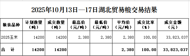 本周湖北贸易粮成交2025年玉米14200吨,成交率100%,成交均价2380元/吨。